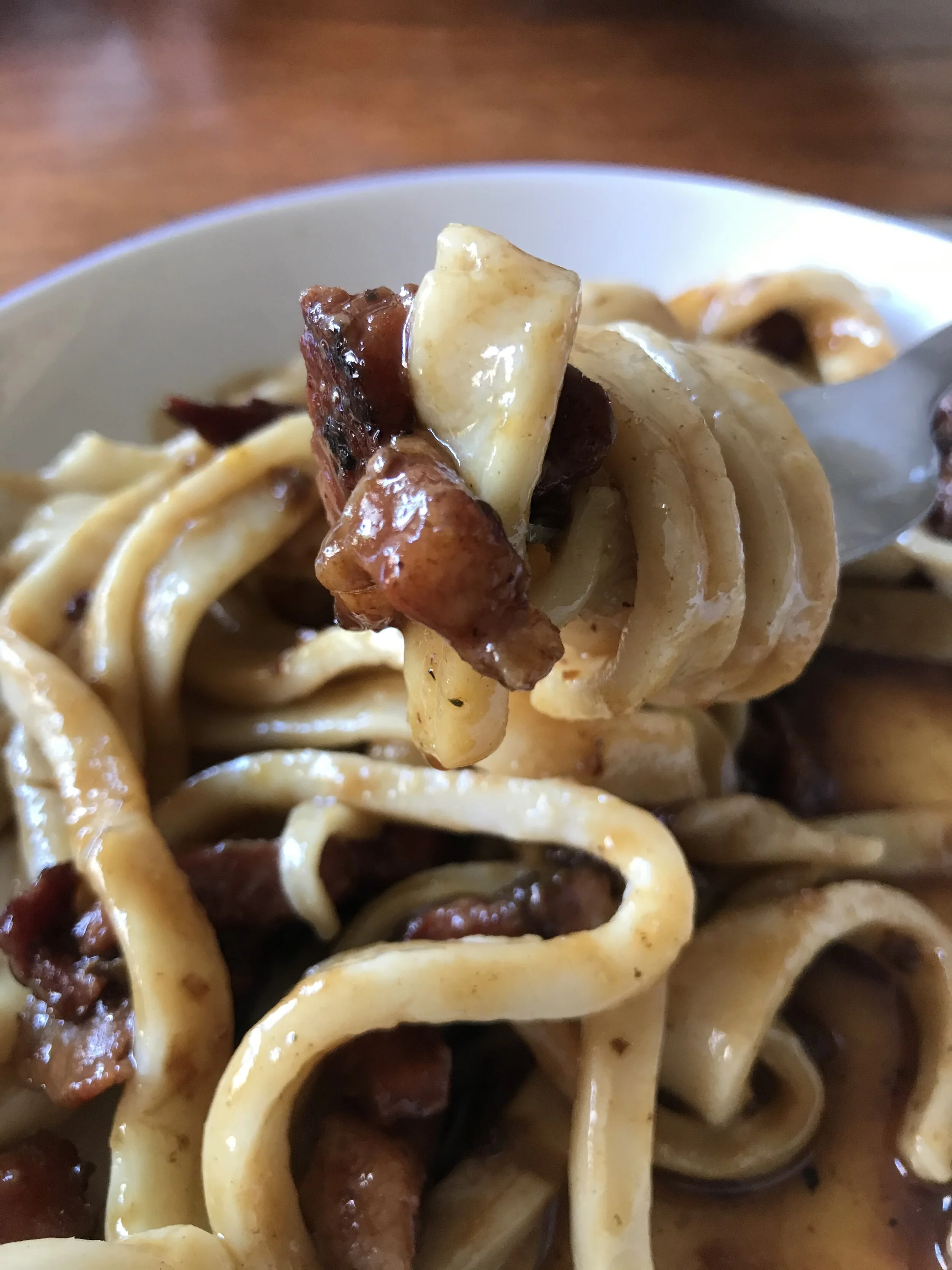 Udon, lardons grillés, caramel miso & oeuf confit